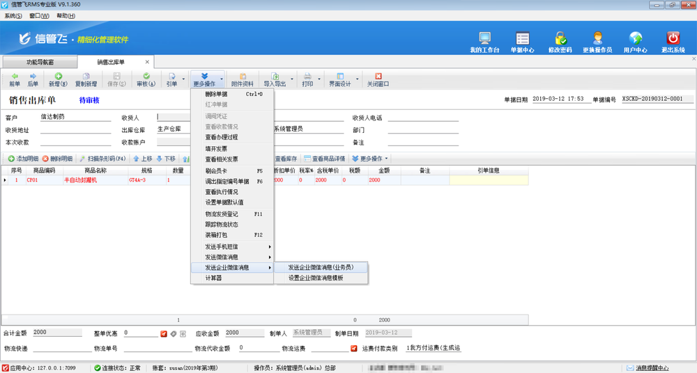 微信消息參數(shù)設(shè)置完成后,新開一個業(yè)務(wù)單據(jù),錄入單據(jù)信息后點擊保存按鈕,然后在工具欄“更多操作”下選擇“發(fā)送企業(yè)微信消息”。系統(tǒng)會根據(jù)消息模板自動生成消息內(nèi)容,點擊“確認(rèn)發(fā)送”會發(fā)送一條消息。