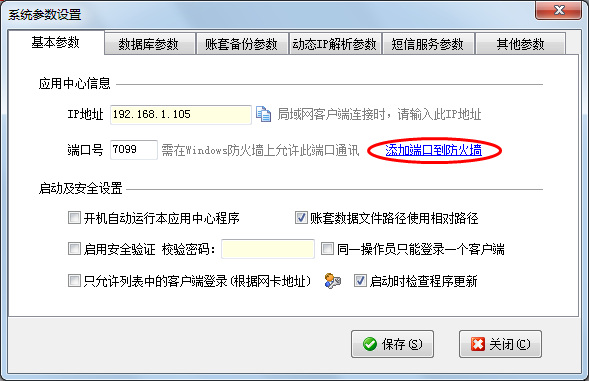 ????主機電腦的Windows防火墻或其他安全軟件的防火墻上需要開放相應的端口,軟件支持自動添加防火墻規則。在應用中心程序點“系統參數”可以設置自動添加端口到防火墻。