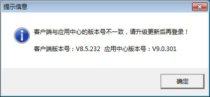????(4)客戶端程序登錄的時候,如果發現與主機電腦上的應用中心程序版本號不一致,會提示如下信息,用相同版本的安裝程序安裝一下即可。