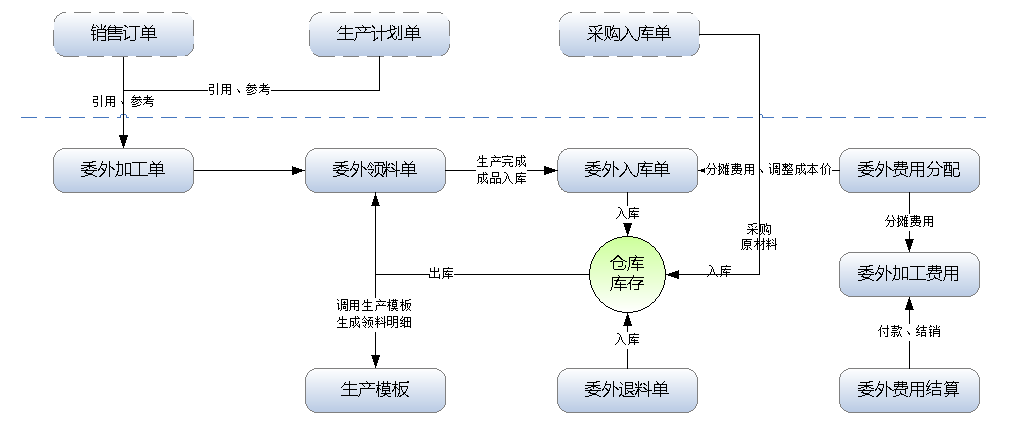 ????實(shí)際的企業(yè)生產(chǎn)業(yè)務(wù)中經(jīng)常會(huì)涉及委外代加工業(yè)務(wù),有時(shí)候需要委托外部工廠幫我們生產(chǎn)一些配件,有時(shí)候需要幫忙生成半成品,然后委外生產(chǎn)的成品或半成品,再進(jìn)入我們車(chē)間進(jìn)行再加工(如包裝封箱、或二次加工等)。專業(yè)版及以上版本可以購(gòu)買(mǎi) “委外加工管理”擴(kuò)展功能模塊來(lái)管理此業(yè)務(wù)。