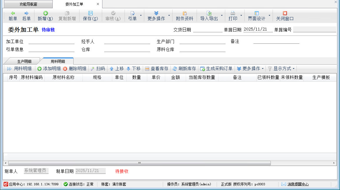 ????對(duì)委外加工需要我們提供原材料(即我們采購(gòu)的原材料),需代加工廠生產(chǎn)時(shí),我們出庫(kù)運(yùn)送給代工廠(也有可能采購(gòu)的原材料直接存放在代加工廠倉(cāng)庫(kù)),這種業(yè)務(wù)模式軟件也提供了較好的支持。