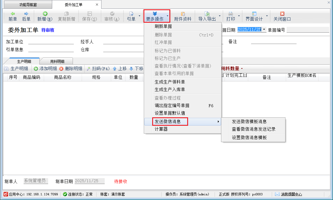 發(fā)送微信消息:點(diǎn)擊“更多操作”—》“發(fā)送微信消息”按鈕,可以進(jìn)行發(fā)送微信模板消息,查看微信消息發(fā)送記錄,設(shè)置微信消息模板等操作。(其中具體操作詳見(jiàn)銷(xiāo)售訂單3.3.1)。