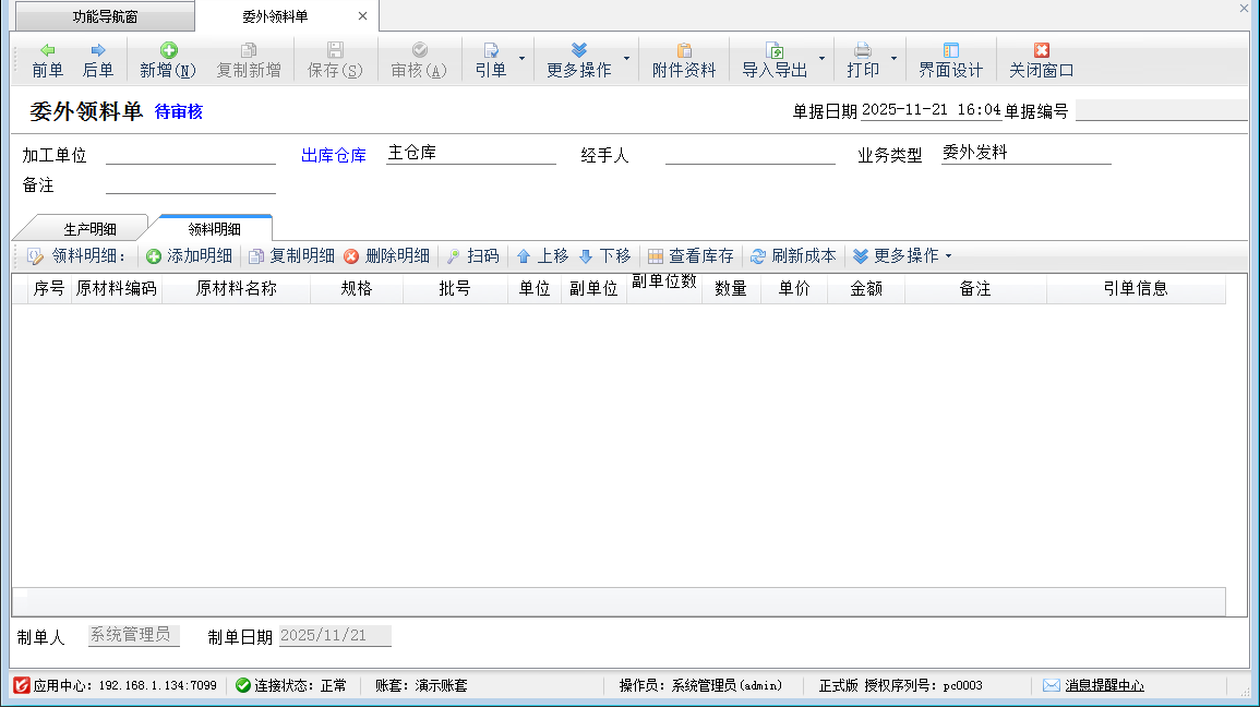 ????在功能導(dǎo)航窗,點(diǎn)“生產(chǎn)管理”—》“委外加工”—》“委外領(lǐng)料單”,即可進(jìn)入委外領(lǐng)料單界面,如下圖所示:
