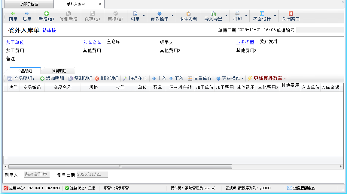????在功能導(dǎo)航窗,點(diǎn)“生產(chǎn)管理”—》“委外加工”—》“委外入庫(kù)單”,即可進(jìn)入委外入庫(kù)單界面,如下圖所示: