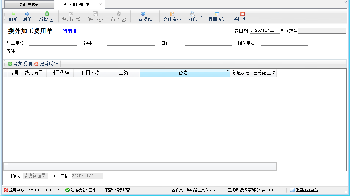 ????(5)委外業(yè)務(wù)還可以管理各種委外費(fèi)用、費(fèi)用付款結(jié)銷(xiāo)、費(fèi)用攤銷(xiāo),分別開(kāi)“委外加工費(fèi)用單”、“委外費(fèi)用結(jié)算單”、“委外費(fèi)用分配單”進(jìn)行處理。