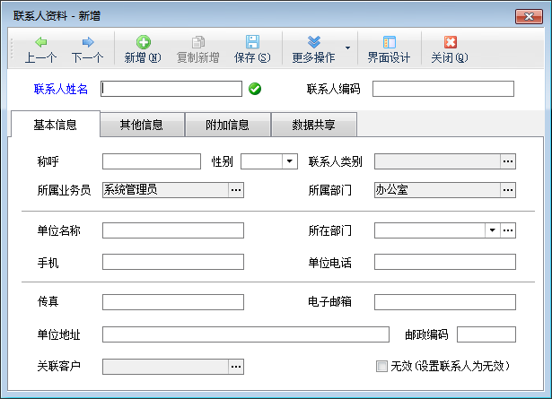 ????(1)客戶名稱為必填項,其他數據為選填項目,可根據情況進行錄入。建議填寫“客戶簡稱”,這樣后續客戶查重時可以提高匹配度。客戶性質分為客戶、供應商、客戶及供應商三種。客戶類別可進行選擇設置。客戶的所屬業務員和所屬部門也可根據情況設置。