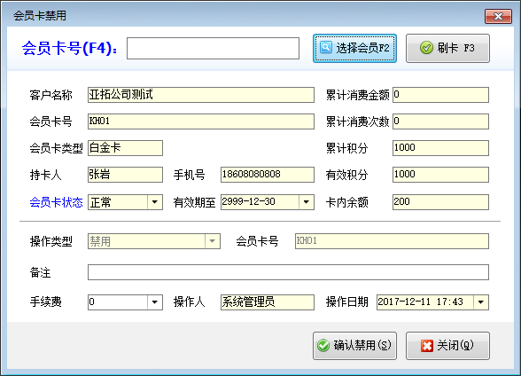 ????在功能導航窗點擊“會員管理”—》“會員卡禁用”,可以打開會員卡禁用窗口,選擇會員后可以對其會員卡進行禁用操作,其界面如下圖所示。