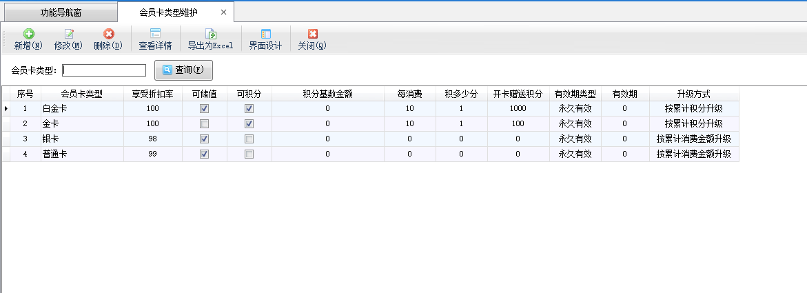 ????在功能導航窗點擊“會員管理”—》“會員卡類型”即可進入會員卡類型維護界面,其界面如下圖所示。