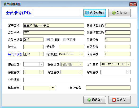 會員卡充值:在工具欄中點擊“會員卡充值”按鈕,可以打開“會員卡充值窗口,選擇會員后,可以對此會員卡進行充值,充值后卡內余額增加。