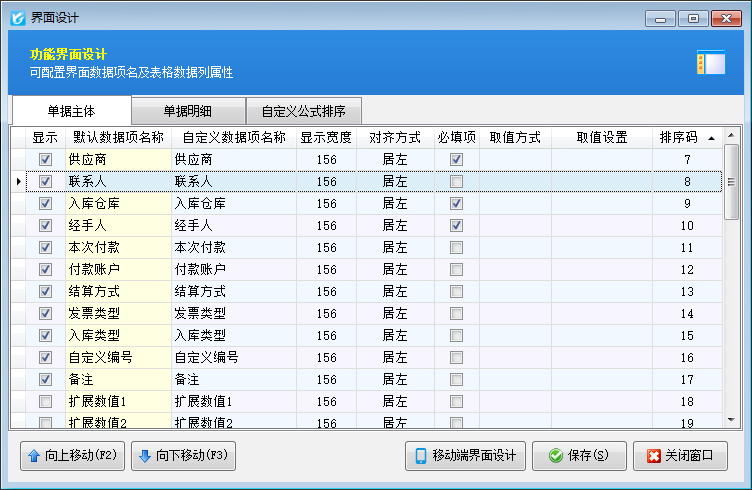 ????② 軟件支持通過界面設計配置單據的數據項,并可調整數據項是否顯示、顯示順序、自定義數據項名稱、顯示寬度、對齊方式、是否必填、取值方式和取值設置等。