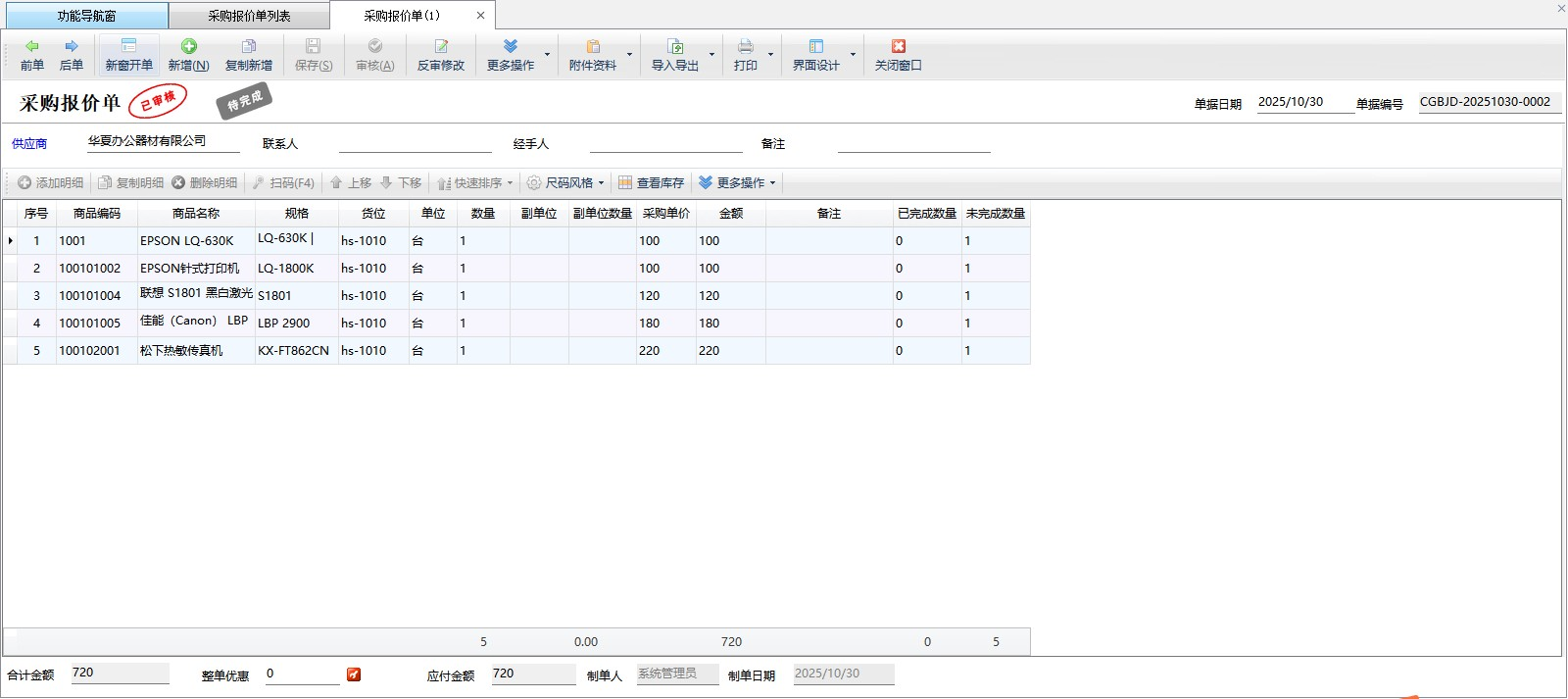 ????采購報價單用于管理采購詢價信息,相對于采購訂單,報價單的采購意向更弱。在采購訂單和采購入庫單中可以調取引用采購報價單。
