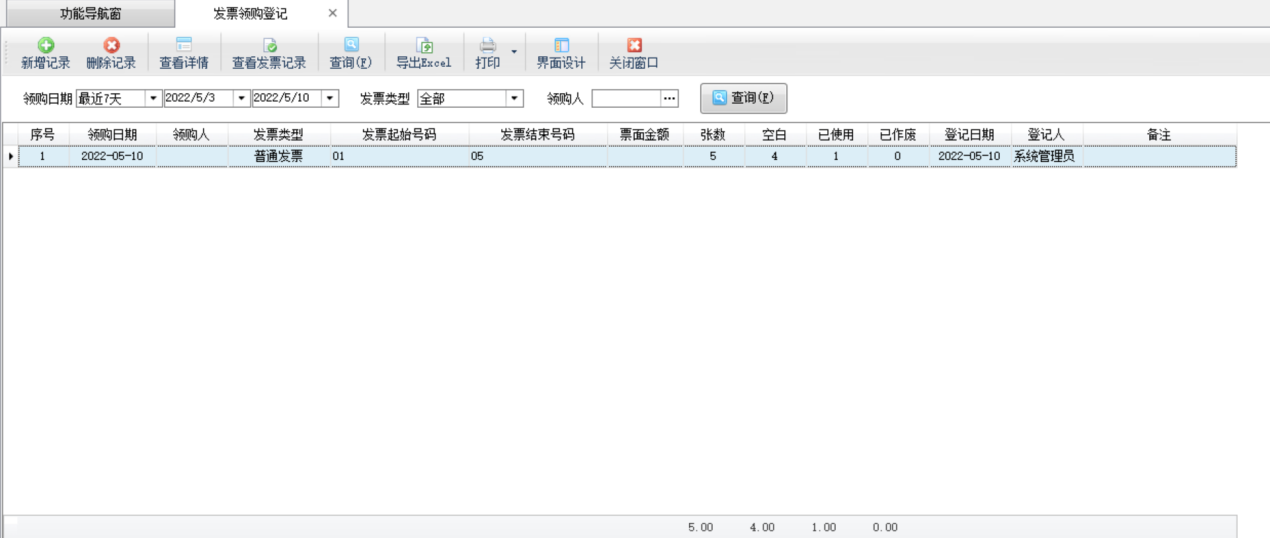 發票領購登記:點擊“發票登記領購”按鈕,進入“發票領購登記”界面,其界面如下圖所示,可以登記空白發票信息、查看發票記錄。