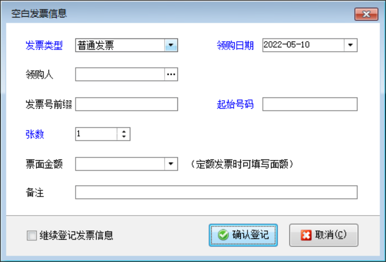 新增記錄:點擊“新增記錄”按鈕,進入“空白發票信息”窗口,如下圖所示,其中“起始號碼”、“張數”是必填項,其他內容根據自己的業務需要進行填寫,最后點擊“確認登記”即可。