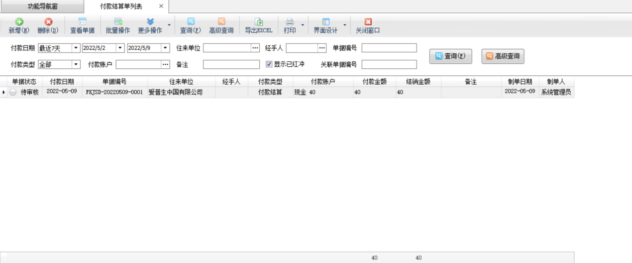 刪除:在工具欄點擊“刪除”按鈕可以刪除未審核的付款結算單,如果單據已審核則不允許直接刪除。已審核的結算單可以紅沖(在結算單窗口點“更多操作”—》“紅沖”)后,然后再刪除。