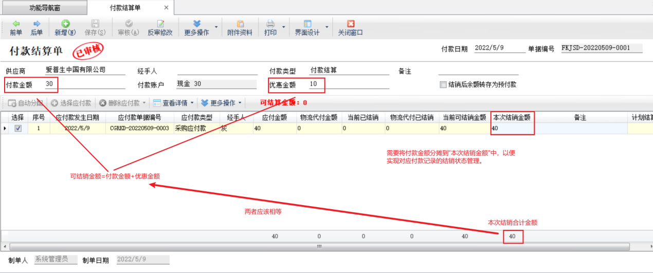 ????① 單據明細中“本次結銷金額”的合計,必須等于可結銷金額(付款金額 + 優惠金額),否則無法保存付款結算單。
