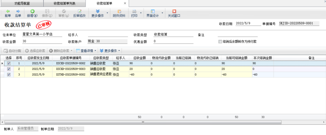 收款結算:在工具欄點擊“收款結算”—》“收款結算”可以對單據進行收款結算。