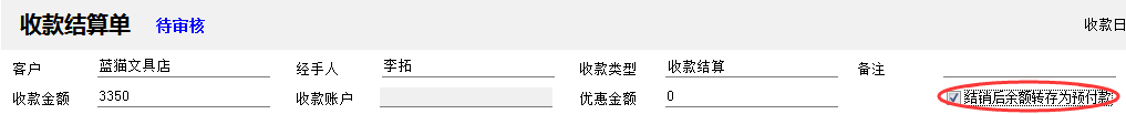 ????部分情況下,客戶付款會多出一些作為預付款(比如此前欠款 4960 元,客戶為了打款方便,直接給我們付款 5000 元),這種情況可以打勾選擇“結銷余額轉為預付款”復選框,軟件會自動生成相應的收款結算單(其收款類型為“客戶預付款”,如上例其金額為 40 元)。