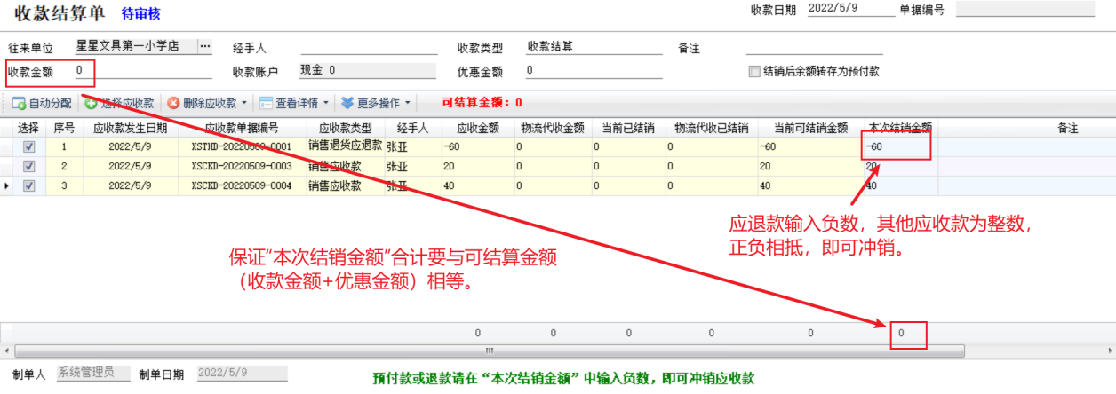 ????① 單據明細中“本次結銷金額”的合計金額,必須等于可結銷金額(收款金額 + 優惠金額),否則無法保存收款結算單。