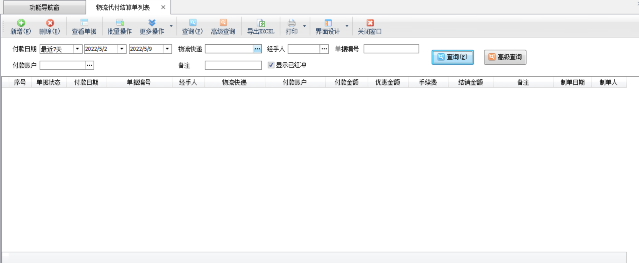刪除:在工具欄點擊“刪除”按鈕可以刪除未審核的物流代付結算單,如果單據已審核則不允許直接刪除。已審核的結算單可以紅沖(在結算單窗口點“更多操作”—》“紅沖”)后,然后再刪除。