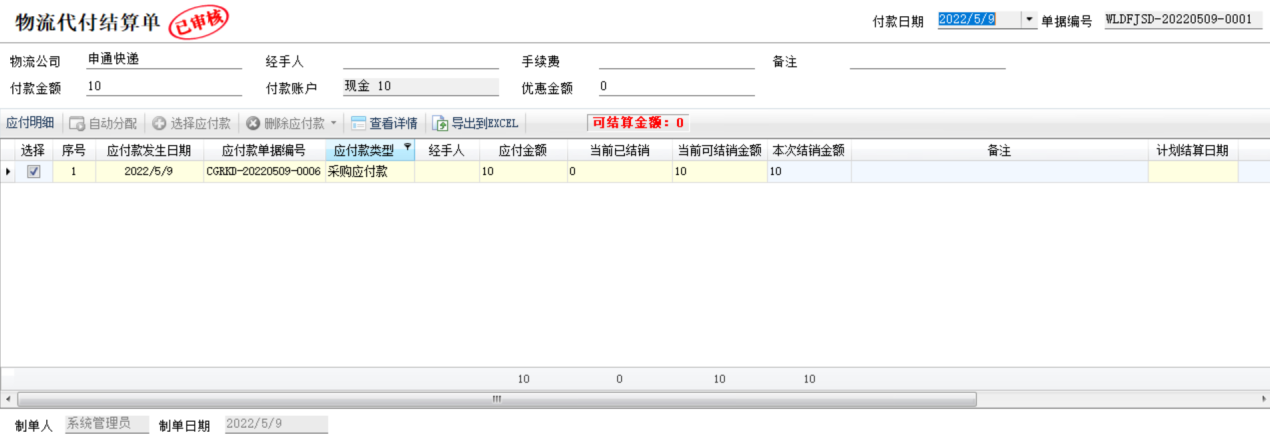 ????物流代付結算單的操作與付款結算單基本一致,這里不再詳述。
