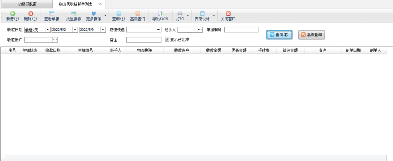 高級查詢:點“高級查詢”按鈕支持更多條件進行物流代收結算單查詢。