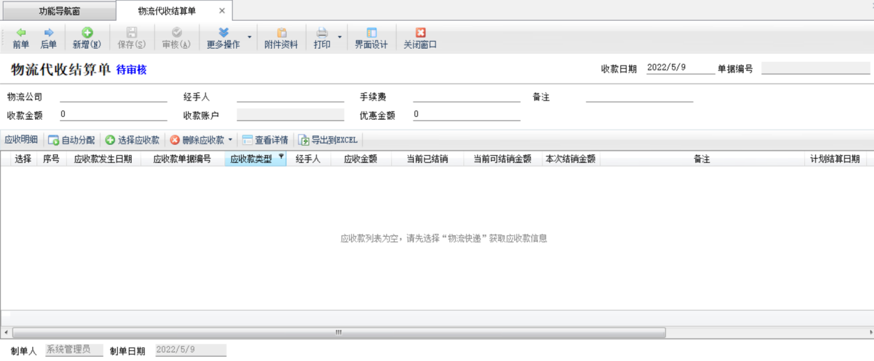 新增:在工具欄點擊“新增”按鈕可以新增物流代收結算單。