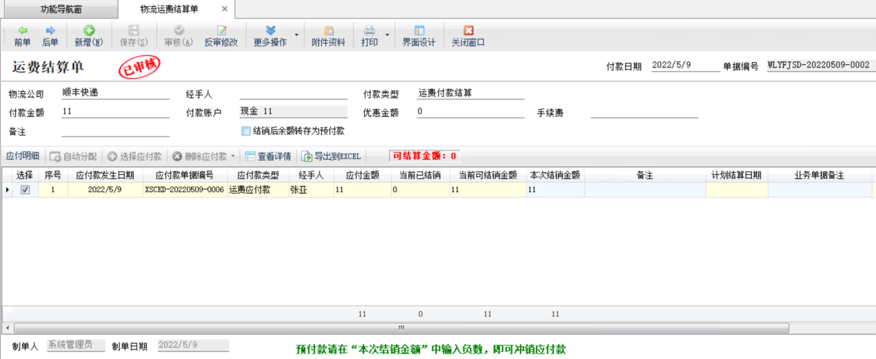 ????物流運費結算單的操作與付款結算單基本一致,這里不再詳述。