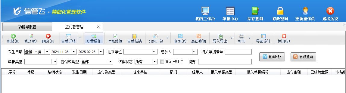 ????應付款管理中支持按照單據日期、單據編號、結銷狀態、往來單位、物流公司、經手人等條件進行查詢。