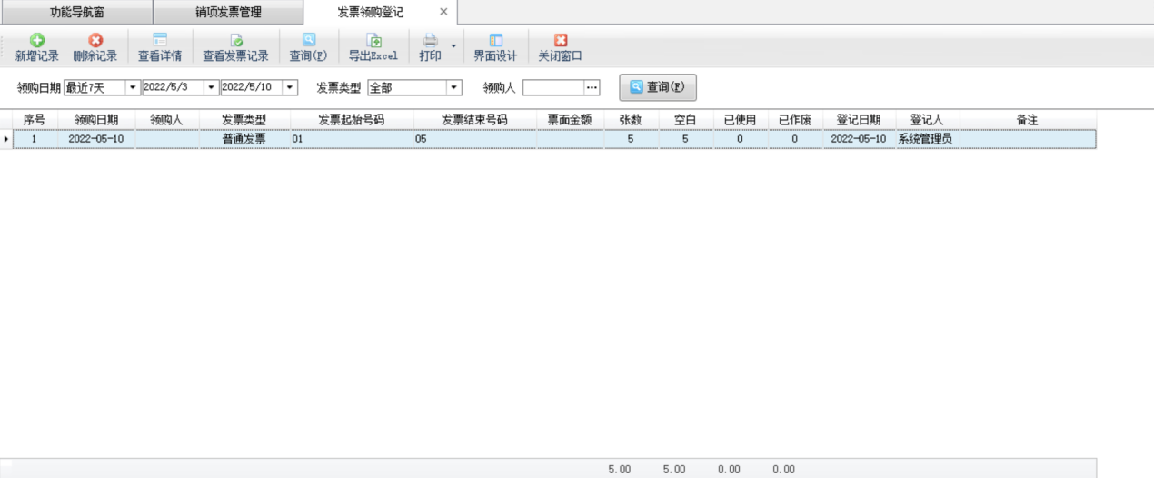 ????發票領購登記是對銷項發票空白發票的領購登記,發票領購登記后,在銷項發票管理界面會出現登記的空白發票記錄,可以用來填開發票。