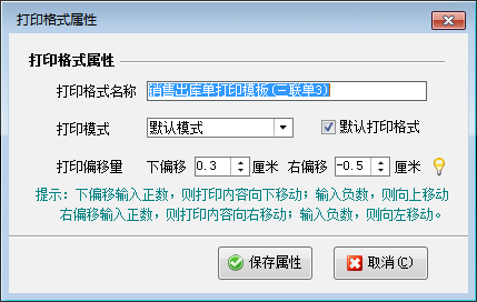修改格式屬性:點“屬性”按鈕可以修改選中的打印格式模板的屬性。其中打印模式包括默認模式、連續(xù)打印模式和填充空行模式。