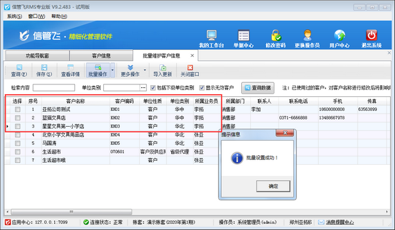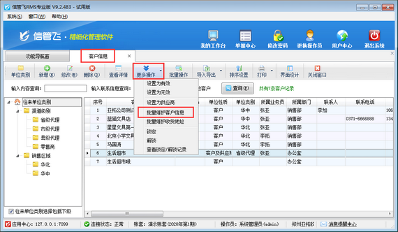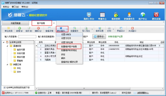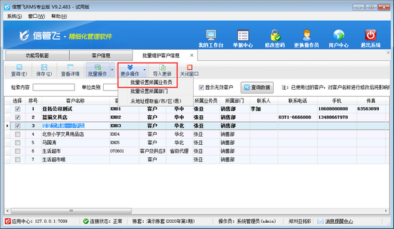 ????然后點擊“更多操作”—》“批量設置所屬業務員”即可,如下圖所示,批量設置選擇的客戶所屬業務員為員工“李拓”。