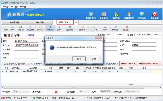 ????本文以“信管飛RMS標準版為例”,示范下如何鎖定超出信用額度的客戶。超出信用額度的客戶“亞拓公司測試”在未設置鎖定前,開銷售出庫單審核單據會提示“當前往來單位將會超出應收信用額度,是否繼續”,點擊“是”仍可以保存成功,如下圖所示: