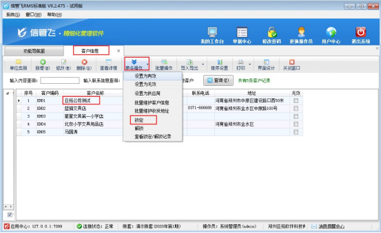 ????在功能導航窗點擊“基礎資料”—》“客戶信息”,在客戶信息界面選擇客戶“亞拓公司測試”,選擇工具欄“更多操作”下的“鎖定”,可鎖定此客戶信息,鎖定狀態為紅色顯示,如下圖所示: