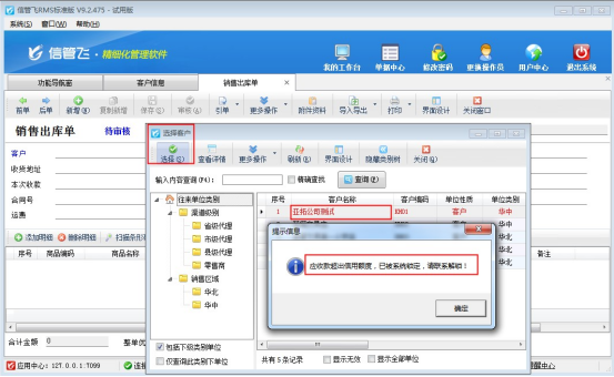 ????客戶“亞拓公司測試”鎖定后,新增銷售出庫單,選擇此客戶名稱,會提示“應收款超出信用額度,已被系統鎖定,請聯系解鎖!”,無法進行選擇開單,如下圖所示: