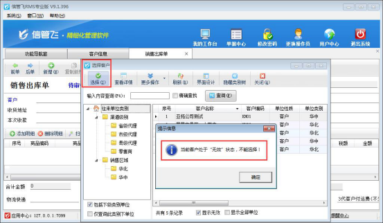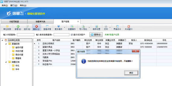 ????信管飛RMS是集采購管理、銷售管理、庫存管理、往來賬管理等為一體的進銷存管理軟件。經常會有用戶問到刪除客戶資料時會彈出提示信息:“當前選擇的往來單位在單據中有使用,不能刪除”(如下圖所示),刪除不了,為什么?
