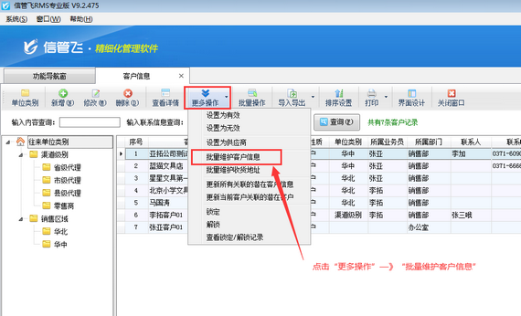 ????在功能導航窗點擊“基礎資料”—》“客戶信息”,在客戶信息界面工具欄點擊“更多操作”下的“批量維護客戶信息”,如下圖所示: