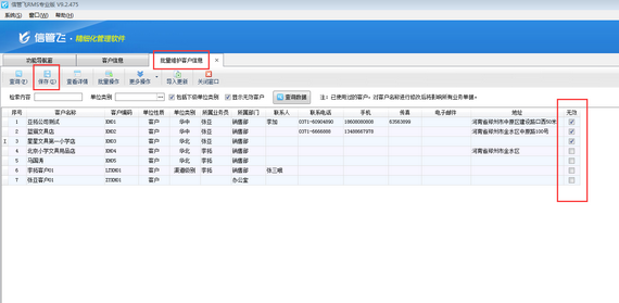 ????進入到批量維護客戶信息界面后,依次對需要設置為無效的客戶信息勾選“無效”列,然后在工具欄點擊“保存”按鈕保存設置即可,如下圖所示: