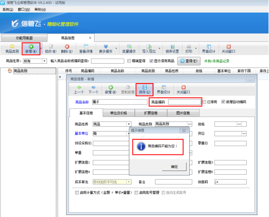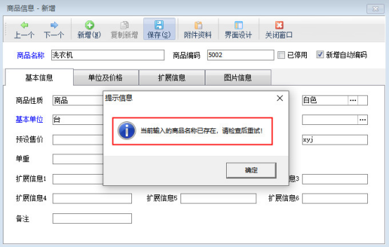 ????設置完成后,打開功能導航窗的“基礎資料”—》“商品信息”,新增一個商品,輸入和之前已有商品一樣的名稱,就可以保存成功了。如下圖所示: