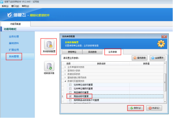 ????客戶遇到以上情況可通過設置商品名稱可重復進行解決。以信管飛送貨單軟件為例,在系統管理—》系統參數配置—》業務參數內將“數據可否重復參數”中的“商品名稱可重復”參數的勾選,然后保存設置。如下圖所示: