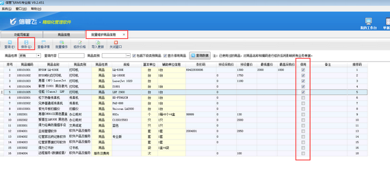 ????進入到批量維護商品信息界面后,依次對需要啟用批號管理的商品勾選“啟用批號管理”列,然后在工具欄點擊“保存”按鈕保存設置即可,如下圖所示: