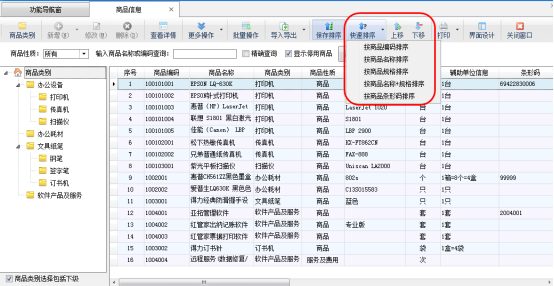 ????登錄軟件,在功能導航窗點“基礎資料”—》“商品信息”即可進入“商品信息”界面,如圖1所示,點“排序設置”按鈕,可進行排序,點“快速排序”會按照字母順序自動排序,包括“按商品編碼排序”、“按商品名稱排序”、“按商品規格排序”“按商品名稱+規格排序”、“按商品條形碼排序”這五種快速排序方法;點“上移”、“下移”按鈕可向上、向下調整顯示位置,如圖2所示: