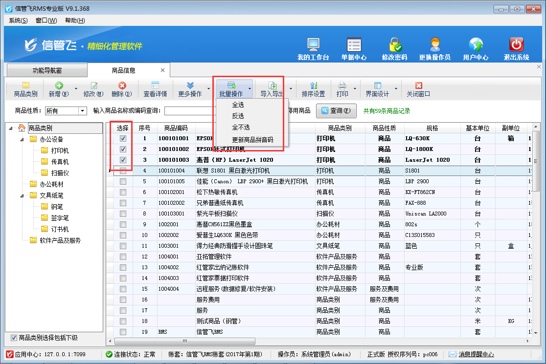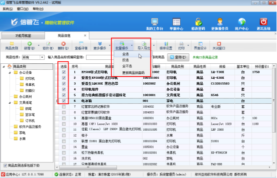 ????在功能導航窗選擇“基礎資料”—》“商品信息”進入商品信息管理界面,選擇工具欄的“批量操作”按鈕,進入批量操作模式,選擇需要刪除的商品信息(批量操作支持全選、全不選、反選),如下圖所示: