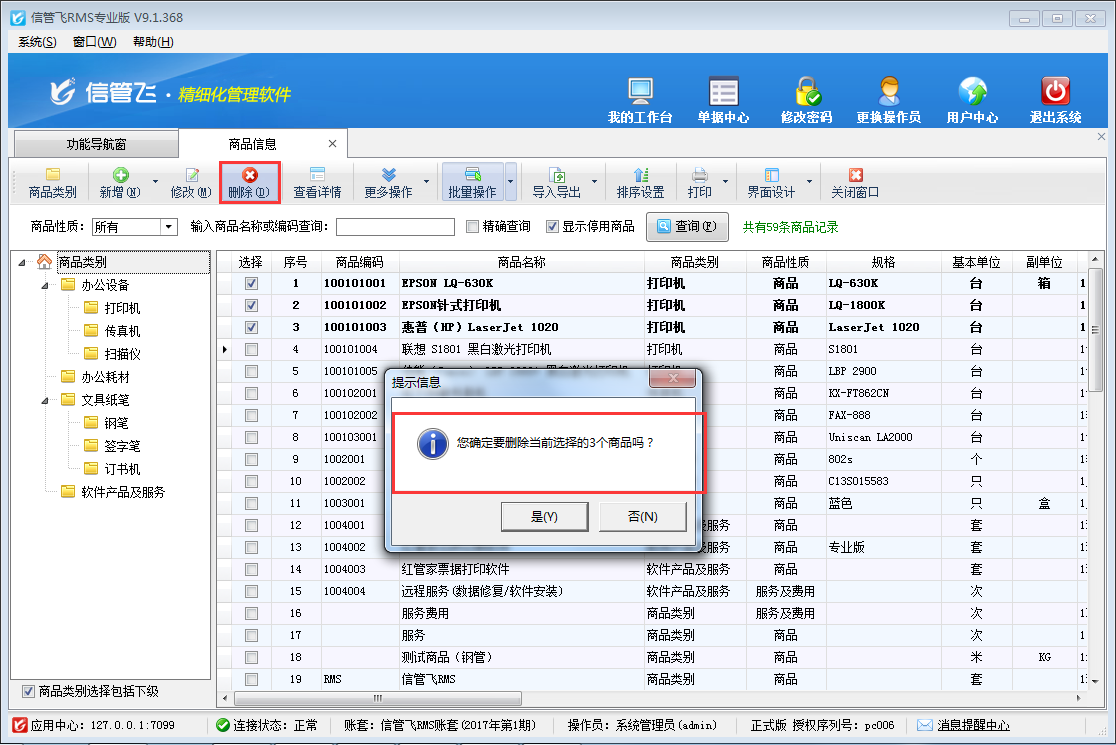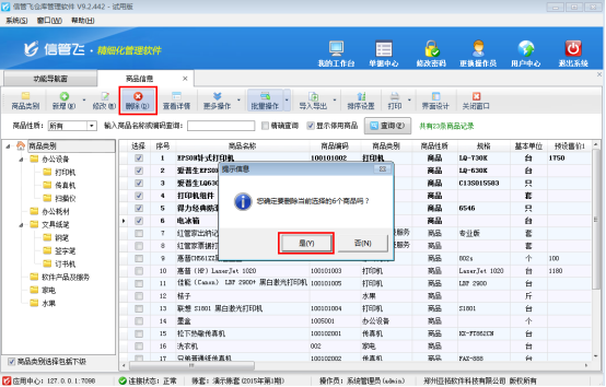 ????批量選擇商品信息后,點擊工具欄的“刪除”按鈕,會提示“您確定要刪除當前選擇的商品嗎?”,點擊“是”按鈕進行批量刪除操作。如下圖所示: