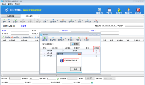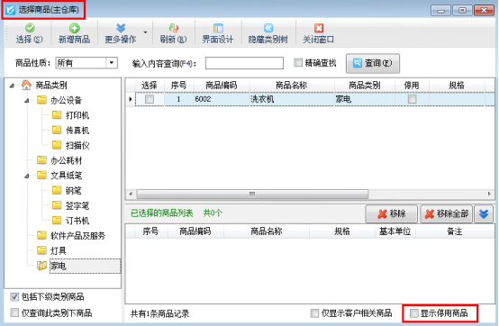 ????設置完成之后,新開一個單據,添加商品明細進行選擇商品時,“選擇商品”窗口默認不顯示已停用的商品,如圖2所示。