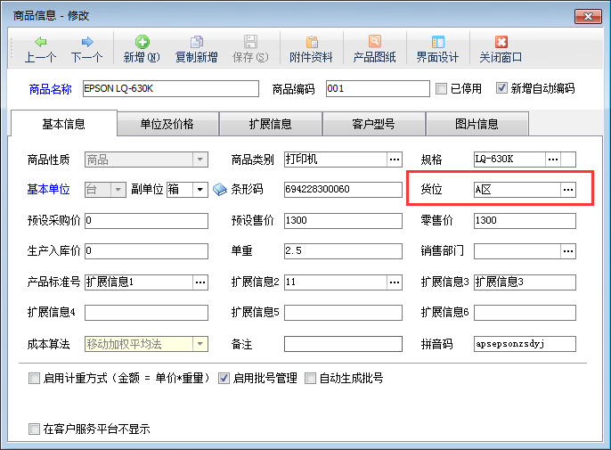 ????進銷存管理軟件在新增商品信息時支持設置每個商品的貨位信息,用于管理商品實際在倉庫中存儲的位置,如下圖所示。另外如果商品信息全部建立好之后,需要補錄入商品貨位,分別修改每個商品信息依次設置每個商品貨位會比較麻煩,本篇文章介紹下如何批量設置商品貨位?