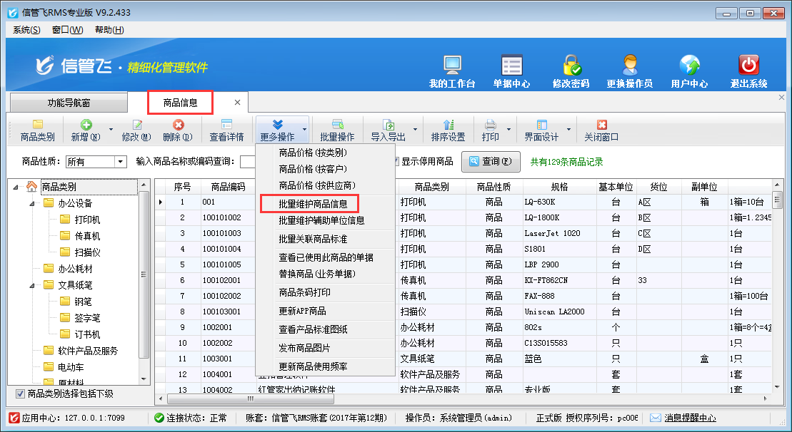 ????在功能導航窗點“基礎資料”—》“商品信息”即可進入“商品信息”界面,然后點擊“更多操作”—》“批量維護商品信息”進入“批量維護商品信息”界面,如下圖所示:
