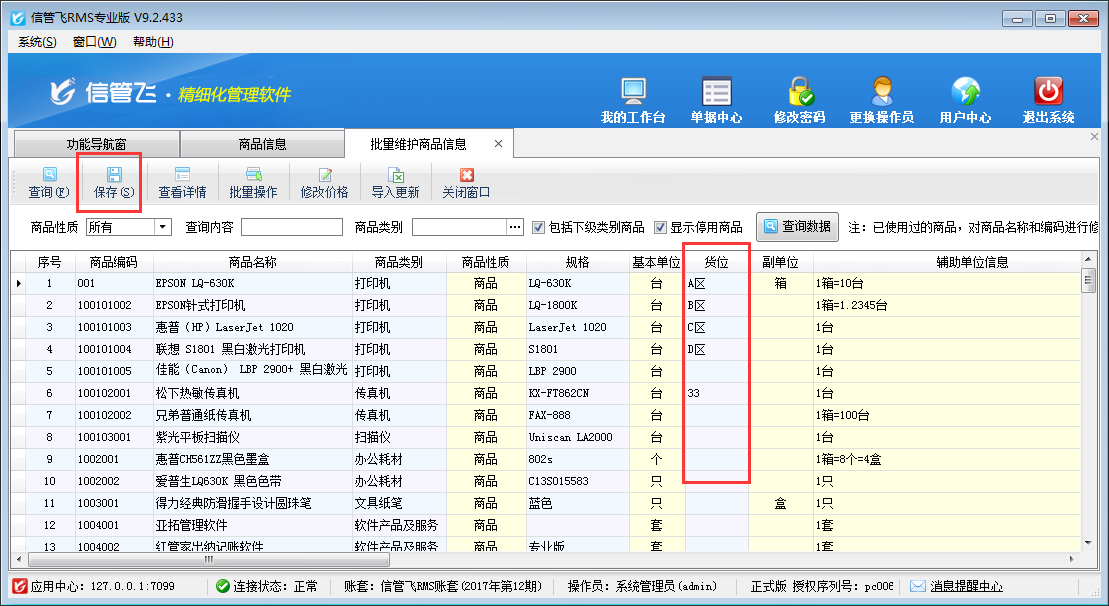 ????進入到批量維護商品信息界面,依次設置每個商品的貨位信息后在工具欄點擊“保存”按鈕保存設置即可,如下圖所示: