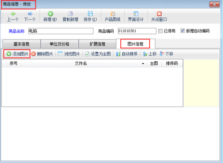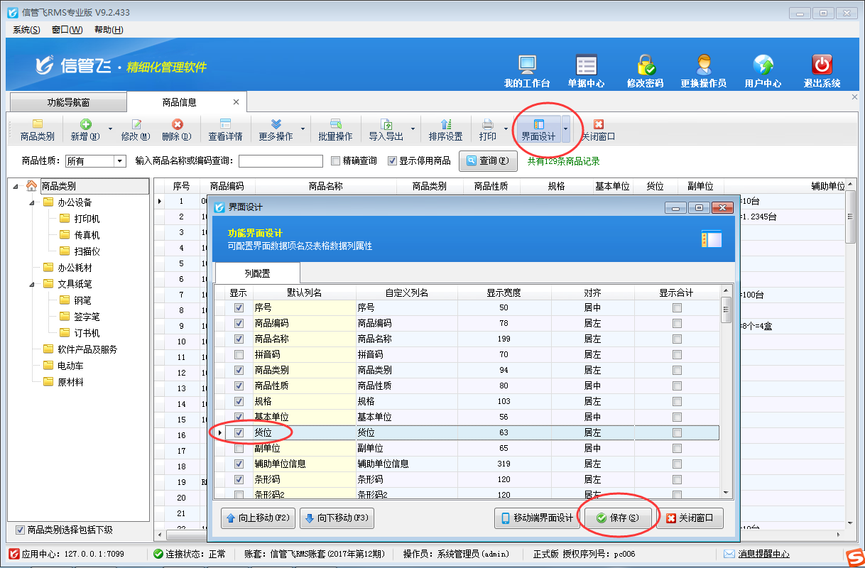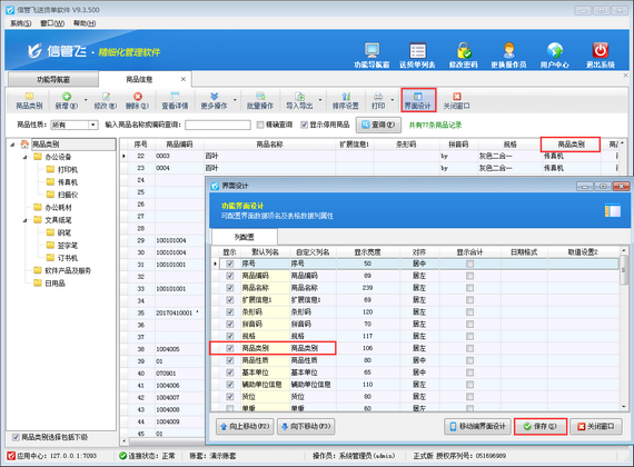 ????首先,在商品信息界面工具欄中點擊“界面設計”打開界面設計界面,將“商品類別”列配置顯示出來,如下圖所示。