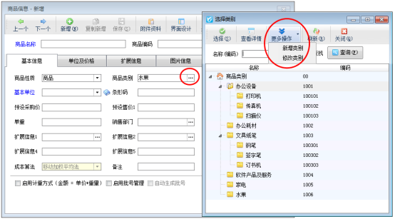 ????在新增商品窗口,點擊“商品類別”后面的“...”選擇按鈕,系統彈出“選擇類別”窗口,在“選擇類別”窗口點擊“更多操作”可以進行新增、修改商品類別操作。如下圖所示:
