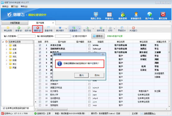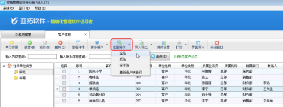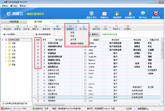 ????批量操作:點“批量操作”按鈕后,可以打勾選擇多個客戶記錄,進行批量操作。
